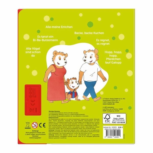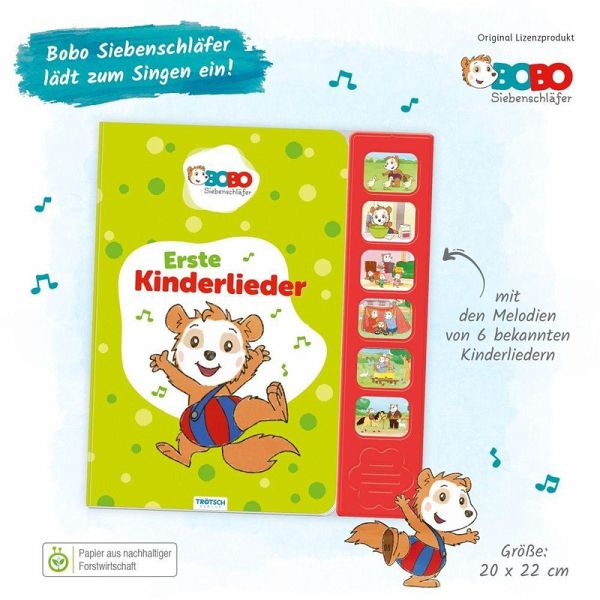 Bobo Siebenschläfer und seine Freunde lieben Musik! Dieses bunte Soundbuch mit den Melodien von 6 bekannten Kinderliedern lädt alle zum Mitsingen ein. Ein toller Spaß für kleine Sänger und Fans von Bobo Siebenschläfer!"Alle meine Entchen", "Backe, backe Kuchen", "Es tanzt ein Bi-Ba-Butzemann", "Alle Vögel sind schon da", "Es regnet, es regnet" und "Hopp, hopp, hopp, Pferdchen lauf Galopp"