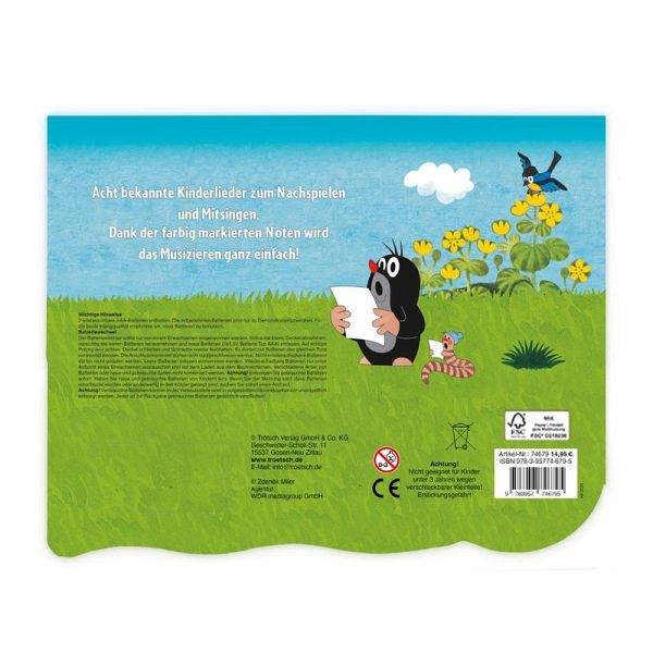Singen und Musizieren mit dem kleinen Maulwurf und seinen Freunden! Acht Lieder mit farbig markierten Noten lassen das Spielen nach Noten schnell gelingen.- Alle meine Entchen- Brüderchen, komm tanz mit mir- Alle Vögel sind schon da- Backe, backe Kuchen- Trarira, der Sommer der ist da- Es regnet, es regnet- Häschen in der Grube- Guten Abend, gut' NachtDas Soundbuch wurde so gestaltet, dass Noten in Form von Farben und Zahlen ersetzt wurden. Das Kind erlernt nicht nur das Musizieren, sondern auch Farben und Zahlen bis 14.Die mitgelieferten Batterien sind nur zu Demonstrationszwecken. Für die beste Klangqualität empfehlen wir, neue Batterien zu benutzen. Um die Spieldauer zu optimieren, sollte der Schalter nach der Benutzung ausgeschaltet werden. (auf "off") Das Buch mit der Soundleiste dient nur der Optik eines Klavieres und fördert somit die Feinmotorik, Farbkoordinierung und Konzentrationsfähigkeit bei den Kleinkindern.