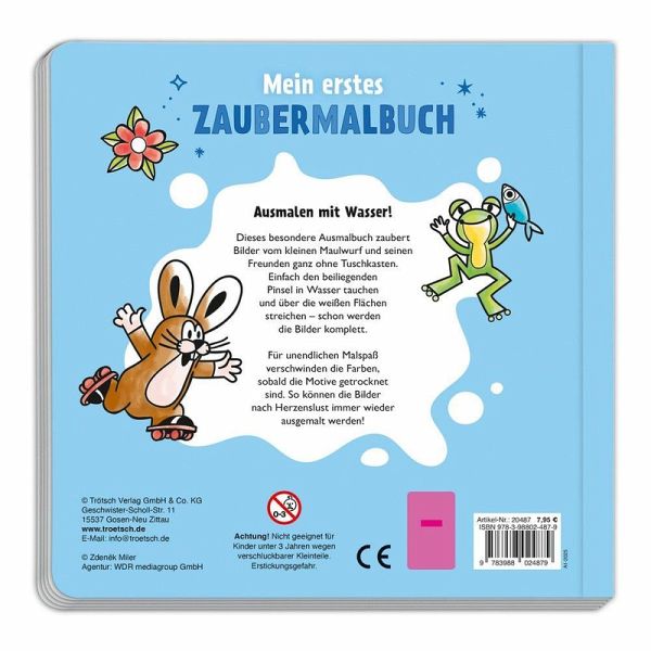 Dieses besondere Ausmalbuch zaubert Bilder vom kleinen Maulwurf und seinen Freunden ganz ohne Tuschkasten. Einfach den beiliegenden Pinsel in Wasser tauchen und über die weißen Flächen streichen - schon werden die Bilder komplett. Für unendlichen Malspaß verschwinden die Farben, sobald die Motive getrocknet sind. So können die Bilder nach Herzenslust immer wieder ausgemalt werden!