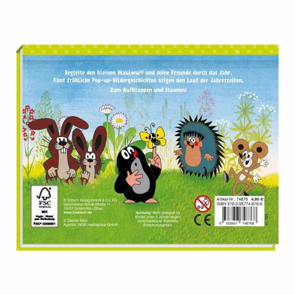 Die beliebten Geschichten von unserem kleinen Maulwurf und seinen Freunden bringen alle Kinderaugen zum leuchten und versüßen die Schlafenszeit. Das feingearbeiteten Pop-up-Buch aus dem wattierten Cover bringt Kinderaugen zum Strahlen. Im handlichen Format passt es in jedem Rucksack oder Tasche und ist ein tolles Mitbringsel. Dieses Buch ergänzt die Mini Pop-up-Reihe des Trötsch Verlags.