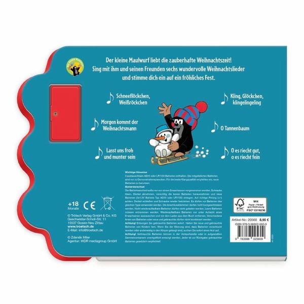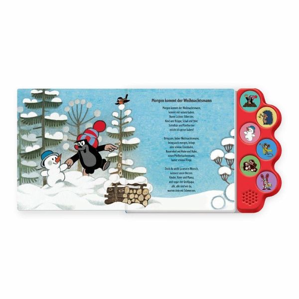 Der kleine Maulwurf und seine Freunde feiern Weihnachten! Dieses bunte Soundbuch mit den Melodien der 6 bekannten Weihnachtslieder "Schneeflöckchen, Weißröckchen", "Kling, Glöckchen, klingelingeling", "Morgen kommt der Weihnachtsmann", "O Tannenbaum", "Lasst uns froh und munter sein" und "O es riecht gut, o es riecht fein" lädt mit liebevoll illustrierten Bildern zum Mitsingen ein. Bei kleinen Texthängern helfen die Liedtexte aus. Ein toller Spaß für kleine Sänger in der Weihnachtszeit!