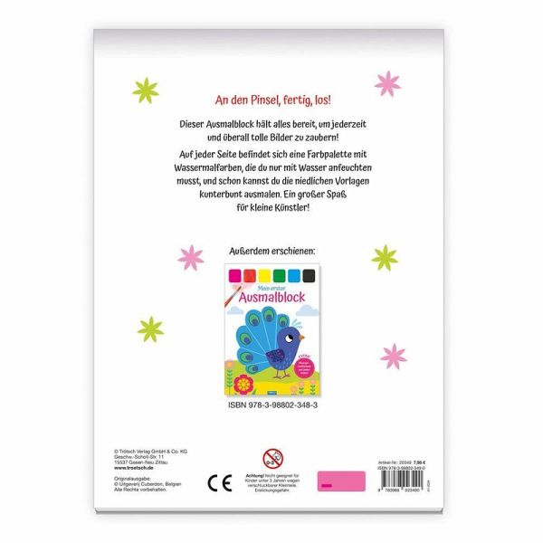 Mit diesem tollen Ausmalblock können kleine Künstler überall und zu jeder Zeit farbenfrohe Kunstwerke schaffen! Auf jeder Seite befindet sich eine Farbpalette mit Wassermalfarben, die nur mit Wasser angefeuchtet werden müssen, und schon können die niedlichen Vorlagen kunterbunt ausgemalt werden.