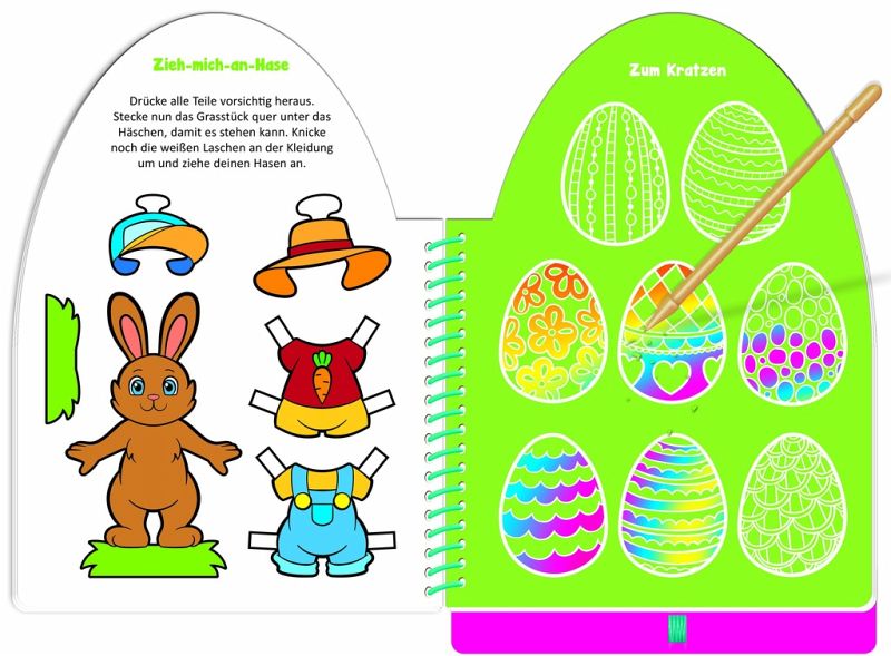 Ein kunterbunter Osterspass mit 5 Kratzseiten und vorgestanzten Bastelelemente auf allen Seiten.Durch Freikratzen der bunten Hintergründe entstehen individuelle Muster und Formen.Ein Farbfeuerwerk, das Lust macht aufs Gestalten.Cover mit Folieneffekt!