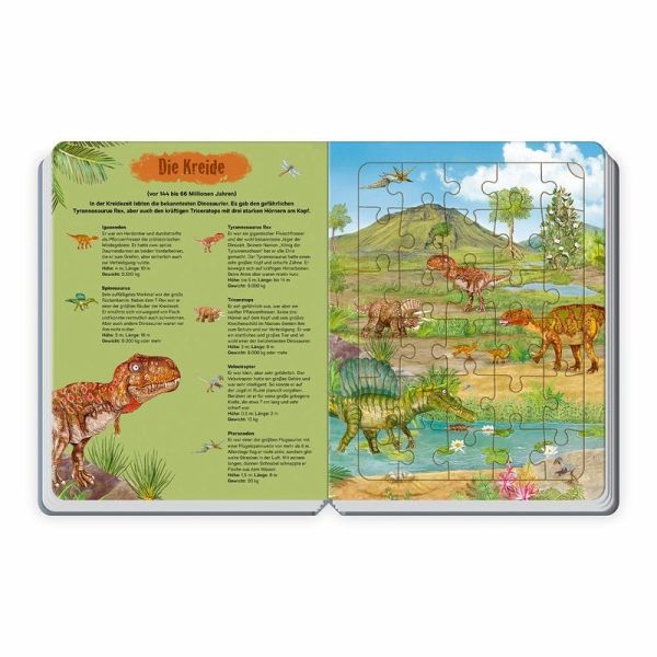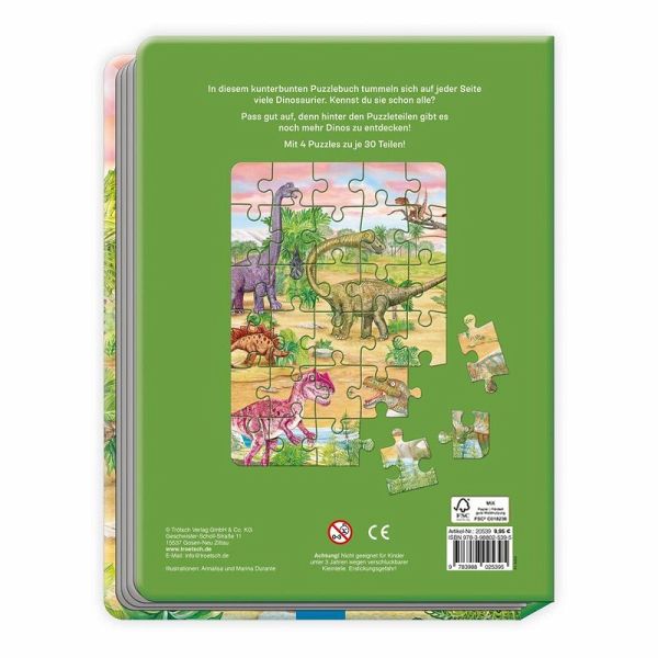 In diesem kunterbunten Puzzlebuch tummeln sich auf jeder Seite viele Dinosaurier. Kennst du sie schon alle? Hinter den Puzzleteilen gibt es auf jeder Seite sogar noch mehr Dinos zu entdecken! Ein fröhlicher Puzzlespaß für kleine Dino-Fans, zum Puzzeln und Entdecken!