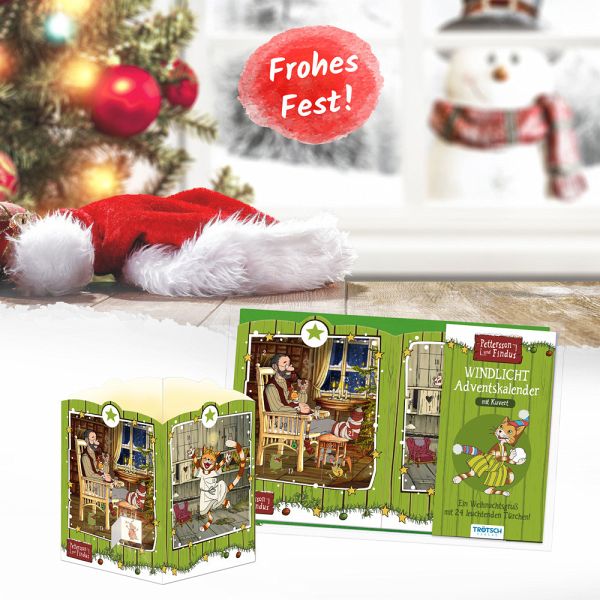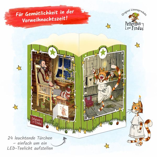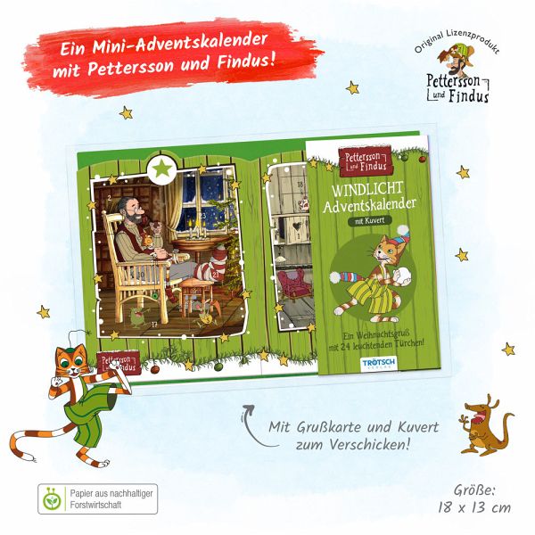 Windlicht und Adventskalender in einem - so zaubert Findus stimmungsvolle Augenblicke in der Vorweihnachtszeit. Einfach um ein LED-Teelicht herum aufstellen und schon strahlen die Motive von Pettersson und Findus hinter den 24 Türchen im goldenen Licht. Dank Briefumschlag und Kärtchen ist der Windlicht-Adventskalender ein ganz besonderer Weihnachtsgruß auch zum Verschicken.