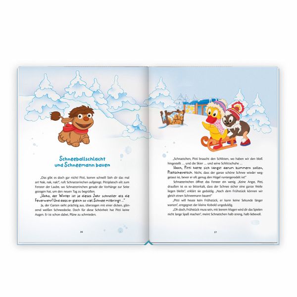 Zum Vorlesen und Einkuscheln! Die 12 farbenfroh illustrierten Wintergeschichten erzählen von den vielen Abenteuern, die unser Sandmännchen und seine Freunde Pitti, Schnatterinchen, Moppi und Herr Fuchs und Frau Elster in der verschneiten Winterwelt erleben: das Sandmännchen im Winterdienst, Pitti beim Eisfischen, der Geburtstag von Herrn Fuchs und viele weitere Erlebnisse warten! Die kurzen Texte sind ideale Einschlaf-Geschichten.