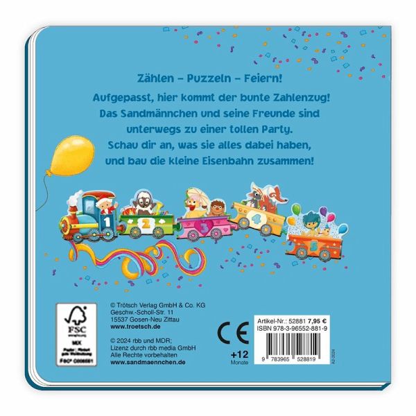 Eingestiegen und aufgepasst! Das Sandmännchen und seine Freunde laden zur Fahrt im Zahlenzug ein, auf der die Kleinsten die Zahlen von 1 bis 5 kennenlernen. Der Umgang mit den Puzzleteilen schult zudem die Feinmotorik, während die liebevollen Illustrationen und kleinen Suchspiele die Fantasie anregen. Das praktische Format macht aus dem vielseitigen Buch das ideale Geschenk oder Mitbringsel.
