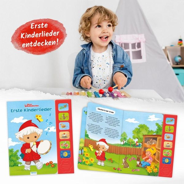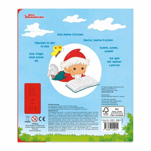 Unser Sandmännchen liebt Musik! Dieses bunte Soundbuch mit den Melodien von 6 bekannten Kinderliedern lädt alle zum Mitsingen ein. Ein toller Spaß für kleine Sänger und Fans von unserem Sandmännchen!"Alle meine Entchen", "Backe, backe Kuchen", "Alle Vögel sind schon da", "Häschen in der Grube" , "Summ, summ, summ!"und "Ich geh mit meiner Laterne"