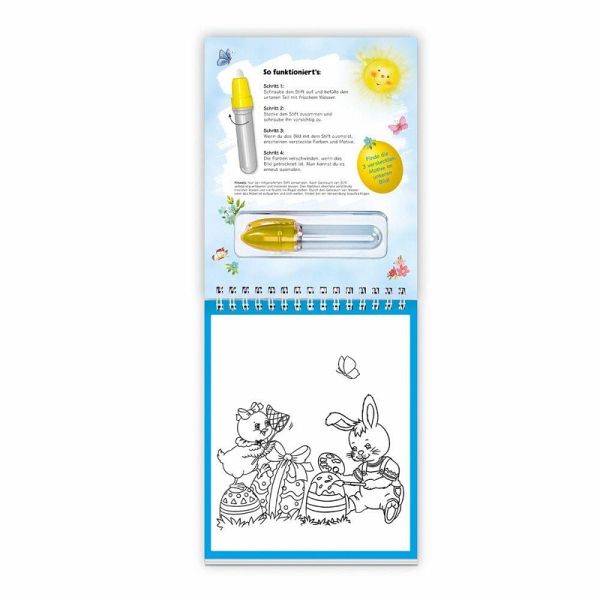 Mit Wasser malen wie von Zauberhand! Dieser besondere Ausmalblock hält tolle Motive und Rätsel für die Osterzeit bereit. Kleine Künstler kommen dabei ganz ohne Tuschkasten oder zusätzliche Stifte aus! Einfach den beiliegenden Zauberstift mit Wasser befüllen, die Seiten ausmalen und schon erscheinen versteckte Farben und Motive. Für unendlichen Malspaß verschwinden diese, sobald die Seiten getrocknet sind. So können die Bilder nach Herzenslust immer wieder ausgemalt werden!