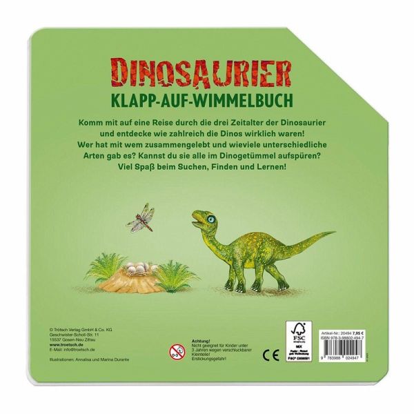 Dieses fröhliche Dinosaurier Wimmelbuch zaubert mit einem besonderen Trick extra große Seiten: einfach aufklappen und schon falten sich die Seiten zu großen Suchbildern auseinander! Komm mit auf eine Reise durch die drei Zeitalter der Dinosaurier und entdecke wie zahlreich die Dinos wirklich waren! Wer hat mit wem zusammengelebt und wieviele unterschiedliche Arten gab es? Kannst du sie alle im Dinogetümmel aufspüren? Viel Spaß beim Suchen, Finden und Lernen!