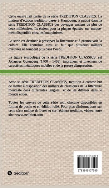 Cette uvre (édition relié) fait partie de la série TREDITION CLASSICS. La maison d édition tredition, basée à Hambourg, a publié dans la série TREDITION CLASSICS des ouvrages anciens de plus de deux millénaires. Ils étaient pour la plupart épuisés ou uniquement disponible chez les bouquinistes. La série est destinée à préserver la littérature et à promouvoir la culture. Avec sa série TREDITION CLASSICS, tredition à comme but de mettre à disposition des milliers de classiques de la littérature mondiale dans différentes langues et de les diffuser dans le monde entier.