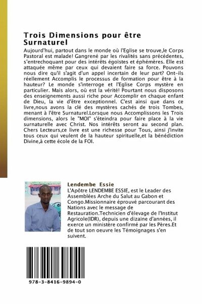 Aujourd'hui, partout dans le monde où l'Eglise se trouve,le Corps Pastoral est malade! Gangrené par les rivalités sans précédentes, s entrechoquant pour des intérêts égoïstes et éphémères. Elle est attaquée même par ceux qui devaient faire sa force. Pouvons nous dire qu'il s'agit d'un appel incertain de leur part? Ont-ils réellement Accomplis le processus de formation pour être à la hauteur? Le monde s'interroge et l'Eglise Corps mystère en particulier. Mais alors, où est la vérité! Pourtant nous disposons des enseignements aussi riche pour Accomplir en chaque enfant de Dieu, la vie d'être exceptionnel. C'est ainsi que dans ce livre,nous avons la clé des mystères cachés de trois Tombes, menant à l'être Surnaturel.Lorsque nous Accomplissons les Trois dimensions, alors le "MOI" s'éteindra pour faire place à la vie surnaturelle avec Christ. Nos intérêts seront au second plan. Chers Lecteurs,ce livre est une richesse pour Tous, ainsi j'invite tous ceux qui veulent de la hauteur spirituelle,et la bénédiction Divine,à cette école de la FOI.