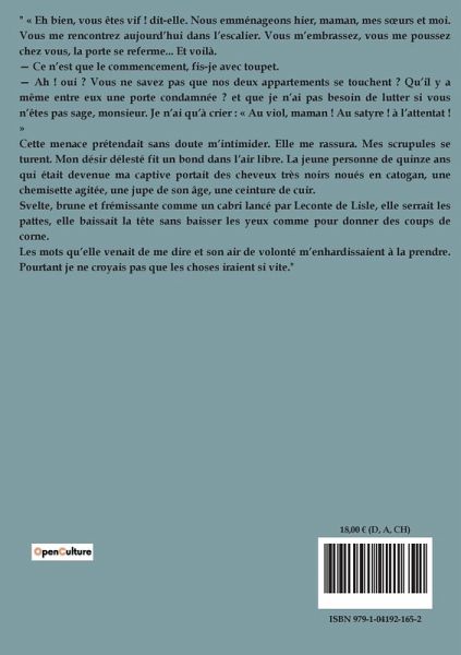 " « Eh bien, vous êtes vif ! dit-elle. Nous emménageons hier, maman, mes s¿urs et moi. Vous me rencontrez aujourd¿hui dans l¿escalier. Vous m¿embrassez, vous me poussez chez vous, la porte se referme... Et voilà. ¿ Ce n¿est que le commencement, fis-je avec toupet. ¿ Ah ! oui ? Vous ne savez pas que nos deux appartements se touchent ? Qüil y a même entre eux une porte condamnée ? et que je n¿ai pas besoin de lutter si vous n¿êtes pas sage, monsieur. Je n¿ai qüà crier : « Au viol, maman ! Au satyre ! à l¿attentat ! » Cette menace prétendait sans doute m¿intimider. Elle me rassura. Mes scrupules se turent. Mon désir délesté fit un bond dans l¿air libre. La jeune personne de quinze ans qui était devenue ma captive portait des cheveux très noirs noués en catogan, une chemisette agitée, une jupe de son âge, une ceinture de cuir. Svelte, brune et frémissante comme un cabri lancé par Leconte de Lisle, elle serrait les pattes, elle baissait la tête sans baisser les yeux comme pour donner des coups de corne. Les mots qüelle venait de me dire et son air de volonté m¿enhardissaient à la prendre. Pourtant je ne croyais pas que les choses iraient si vite."