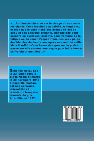 ... Antoinette observe sur le visage de son amie les signes d'une lassitude accablée. À vingt ans, et bien que le sang riche des brunes colore sa peau et ses cheveux brillants, Annonciade peut prendre en quelques instants, sous l'empire de la fatigue ou du souci, l'aspect fané, les yeux pâles des blondes de trente ans après une nuit de veille. Mais il suffit qu'une heure de repos ou de plaisir passe sur elle comme une vague pour lui redonner sa fraîcheur mouillée...