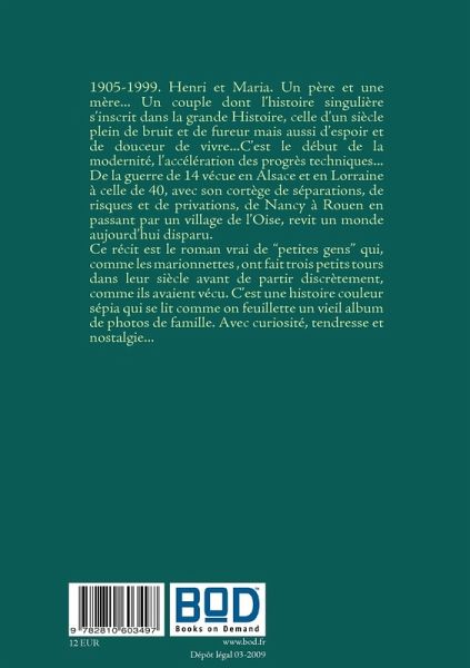 1905-1999. Henri et Maria. Un père et une mère... Un couple dont l¿histoire singulière s¿inscrit dans la grande Histoire, celle d¿un siècle plein de bruit et de fureur mais aussi d¿espoir et de douceur de vivre...C¿est le début de la modernité, l¿accélération des progrès techniques... De la guerre de 14 vécue en Alsace et en Lorraine à celle de 40, avec son cortège de séparations, de risques et de privations, de Nancy à Rouen en passant par un village de l¿Oise, revit un monde aujourd¿hui disparu. Ce récit est le roman vrai de « petites gens » qui, comme les marionnettes , ont fait trois petits tours dans leur siècle avant de partir discrètement, comme ils avaient vécu. C¿est une histoire couleur sépia qui se lit comme on feuillette un vieil album de photos de famille. Avec curiosité, tendresse et nostalgie...