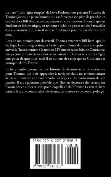 Le livre "Trois règles simples" de Dave Kerlson nous présente l'histoire de Thomas James, un jeune homme qui est forcé par son père de prendre un emploi chez Bill Bard, un entrepreneur en construction. Thomas, qui est étudiant en informatique, est relutant à l'idée de passer son été à travailler dans la construction, mais il accepte finalement pour ne pas décevoir son père. Lors de son premier jour de travail, Thomas rencontre Bill Bard, qui lui explique les trois règles simples à suivre pour réussir dans son entreprise : arriver à l'heure, rentrer à la maison à l'heure et rester loin de Constance, une personne mystérieuse dont on ne sait rien. Thomas accepte ces règles sans poser de questions, mais il est curieux de savoir qui est Constance et pourquoi il doit l'éviter. Le livre semble promettre une histoire de découverte et de croissance pour Thomas, qui doit apprendre à naviguer dans un environnement de travail nouveau et à comprendre les règles et les motivations de son patron. Il est également possible que Thomas découvre des secrets sur Constance et sur les raisons pour lesquelles il doit l'éviter. Le ton du livre semble être une combinaison de drame, de mystère et de coming-of-age.