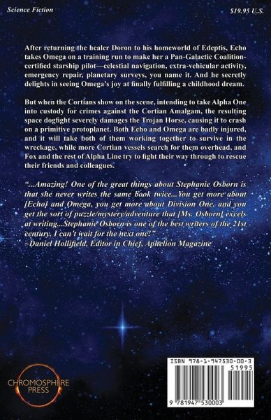 After returning the healer Doron to his homeworld of Edeptis, Echo takes Omega on a training run to make her a Pan-Galactic Coalition-certified starship pilot—celestial navigation, extra-vehicular activity, emergency repair, planetary surveys, you name it. And he secretly delights in seeing Omega’s joy at finally fulfilling a childhood dream. But when the Cortians show on the scene, intending to take Alpha One into custody for crimes against the Cortian Amalgam, the resulting space dogfight severely damages the Trojan Horse, causing it to crash on a primitive protoplanet. Both Echo and Omega are badly injured, and it will take both of them working together to survive in the wreckage, while more Cortian vessels search for them overhead, and Fox and the rest of Alpha Line try to fight their way through to rescue their friends and colleagues.