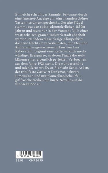 Ein leicht schrulliger Sammler bekommt durch eine Internet-Anzeige ein wunderschönes Tasteninstrument geschenkt. Der Flügel stammt aus den biedermeierlichen 1850er Jahren und muss nur in der Vorstadt-Villa einer westsächsischen Industriestadt abgeholt werden. Nachdem die riesige Klimperkiste die erste Nacht im verwahrlosten, mit Efeu und Knöterich eingewachsenen Haus von Luis Raber steht, beginnt eine Kette wirklich merkwürdiger Ereignisse, an deren Ende die Aufklärung eines eigentlich perfekten Verbrechen aus dem Jahr 1926 liegt. Die wunderschöne und talentierte Art-Deco-Pianistin Senta Arden und der trinkfeste, heimatinteressierte Gastwirt Dankmar, schwere Limousinen und mittelamerikanische Pfeilgiftfrösche treiben die kurze Novelle auf ihr furioses Ende zu.
