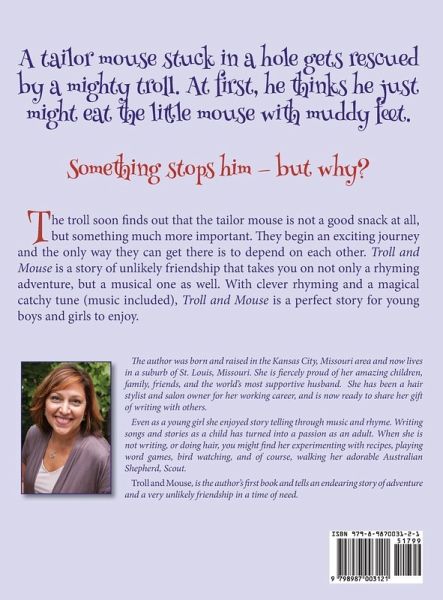 A tailor mouse stuck in a hole gets rescued by a mighty troll. At first, he thinks he just might eat the little mouse with muddy feet. Something stops him - but why? The troll soon finds out that the tailor mouse is not a good snack at all, but something much more important. They begin an exciting journey and the only way they can get there is to depend on each other. Troll and Mouse is a story of unlikely friendship that takes you on not only a rhyming adventure, but a musical one as well. With clever rhyming and a magical catchy tune, Troll and Mouse is a perfect story for young boys and girls to enjoy.