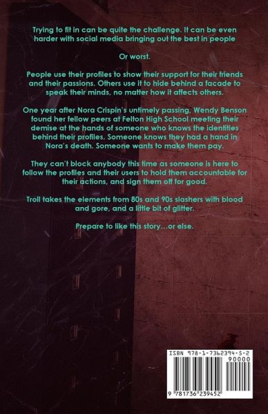 Trying to fit in can be quite the challenge. It can be even harder with social media bringing out the best in people. Or worst. People use their profiles to show their support for their friends and their passions. Others use it to hide behind a facade to speak their minds, no matter how it affects others. One year after Nora Crispin's untimely passing, Wendy Benson found her fellow peers at Felton High School meeting their demise at the hands of someone who knows the identities behind their profiles. Someone knows they had a hand in Nora's death. Someone wants to make them pay. They can't block anybody this time as someone is here to follow the profiles and their users to hold them accountable for their actions, and sign them off for good. Troll takes the elements from 80s and 90s slashers with blood and gore, and a little bit of glitter. Prepare to like this story...or else.