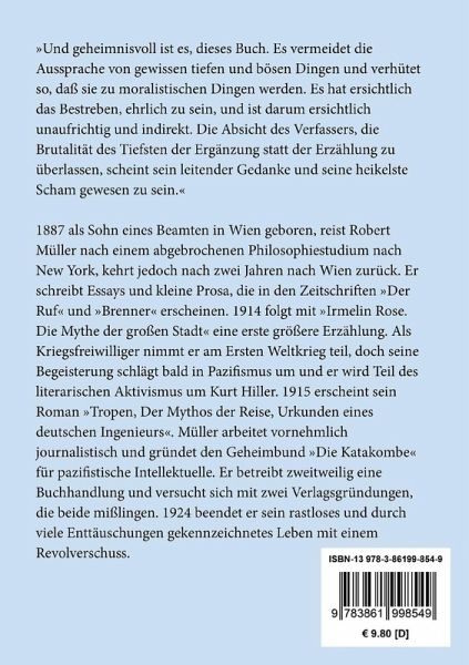 1887 als Sohn eines Beamten in Wien geboren, reist Robert Müller nach einem abgebrochenen Philosophiestudium nach New York, kehrt jedoch nach zwei Jahren nach Wien zurück. Er schreibt Essays und kleine Prosa, die in den Zeitschriften "Der Ruf" und "Brenner" erscheinen. 1914 folgt mit "Irmelin Rose. Die Mythe der großen Stadt" eine erste größere Erzählung. Als Kriegsfreiwilliger nimmt er am Ersten Weltkrieg teil, doch seine Begeisterung schlägt bald in Pazifismus um und er wird Teil des literarischen Aktivismus um Kurt Hiller. 1915 erscheint sein Roman "Tropen, Der Mythos der Reise, Urkunden eines deutschen Ingenieurs". Müller arbeitet vornehmlich journalistisch und gründet den Geheimbund "Die Katakombe" für pazifistische Intellektuelle. Er betreibt zweitweilig eine Buchhandlung undversucht sich mit zwei Verlagsgründungen, die beide mißlingen. 1924 beendet er sein rastloses und durch viele Enttäuschungen gekennzeichnetes Leben mit einem Revolverschuss.