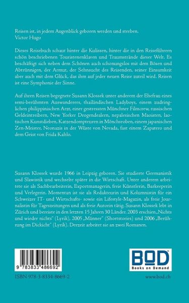 Reisen ist, in jedem Augenblick geboren werden und sterben. Victor Hugo Dieses Reisebuch schaut hinter die Kulissen, hinter die in den Reiseführern schön beschriebenen Touristenenklaven und Traumstrände dieser Welt. Es beschäftigt sich neben dem Schönen auch schonungslos mit dem Bösen und Abtrünnigem, der Armut, der Sehnsucht des Reisenden, seiner Einsamkeit aber auch mit dem Glück, das ihm auf jeder neuen Reise zuteil wird. Reisen ist eine Symphonie der Sinne.Auf ihren Reisen begegnete Susann Klossek unter anderem der Ehefrau eines semi-berühmten Auswanderers, thailändischen Ladyboys, einem zudringlichen philippinischen Arzt, einer gestressten Münchner Filmcrew, russischen Geldeintreibern, New Yorker Drogendealern, nepalesischen Maoisten, laotischen Kunstdieben, Katzendompteuren in Mönchsroben, einem japanischen Zen-Meister, Neonazis in der Wüste von Nevada, fast einem Zapatero und dem Geist von Frida Kahlo.