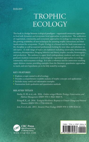 This book is a review of trophic concepts in ecology for organismal-oriented ecologists interested in ecosystem ecology. The book explains a wide range of topics including autotrophy, heterotrophy, omnivory, decomposition, foraging behavior and theory, trophic cascades, bioenergetics, and production. The book is intended for upper-level undergraduate students and entry-level graduate students interested in autecological, organismal approaches to ecology, community and ecosystem ecology. It is also a reference text for instructors teaching upper-division courses, providing examples from the literature, quantitative approaches to teach, and new hypotheses yet to be fully tested by ecologists.