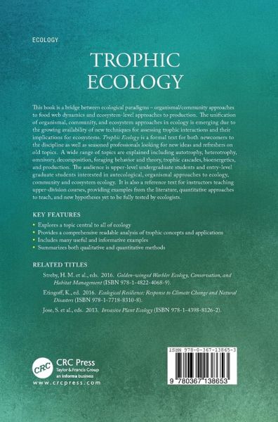 1. Introduction and History of Trophic Ecology Concepts and Patterns 2. Trophic Pyramids and Trophic Levels 3. Scavenging and Decomposition Mechanisms at the organismal Scale 4. Foraging in Patches 5. Predation 6. Prey Diet Data, Modeling, and Energetics Approaches 7. Analyzing Diets 8. Bioenergetics, Ecosystem Metabolism, and Metabolic Theory 9. Consumption and Nutrition Community and ecosystem concepts 10. Food Webs 11. Secondary Production Quantifying Material Flux and Synthesis 12. Nutrient Dynamics and Stoichiometry 13. Elements and Isotopes as Tracers 14. Use and Importance of Lipids in Trophic Ecology 15. Synthesis for Trophic Ecology