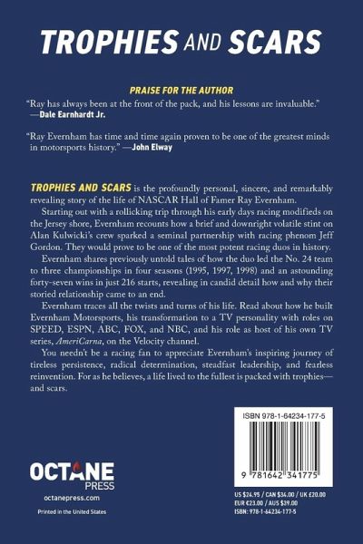 "Trophies and Scars is the profoundly personal, sincere, and remarkably revealing story of the life and times of NASCAR Hall of Famer Ray Evernham. Starting out with a rollicking trip through his early days racing modifieds on the Jersey shore, Evernham recounts how a brief and downright volatile stint on Alan Kulwicki's crew sparked a seminal partnership with racing phenom Jeff Gordon. They would prove to be one of the most potent racing duos in history. Evernham shares previously untold tales of how the duo led the No. 24 team to three championships in four seasons (1995, 1997, 1998) and a series-leading forty-nine wins, revealing in candid detail how and why their storied relationship came to an end. Evernham traces all the twists and turns of his life. Read about how he built Evernham Motorsports, his transformation to a TV personality with roles on SPEED, ESPN, ABC, FOX, and NBC, and his role as host of his own TV series, AmeriCarna, on the Velocity channel. You needn't be a racing fan to appreciate Evernham's inspiring journey of tireless persistence, radical determination, steadfast leadership, and fearless reinvention. For as he believes, a life lived to the fullest is packed with trophies-and scars"--