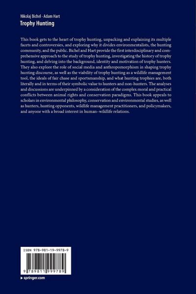 This book gets to the heart of trophy hunting, unpacking and explaining its multiple facets and controversies, and exploring why it divides environmentalists, the hunting community, and the public. Bichel and Hart provide the first interdisciplinary and comprehensive approach to the study of trophy hunting, investigating the history of trophy hunting, and delving into the background, identity and motivation of trophy hunters. They also explore the role of social media and anthropomorphism in shaping trophy hunting discourse, as well as the viability of trophy hunting as a wildlife management tool, the ideals of fair chase and sportsmanship, and what hunting trophies are, both literally and in terms of their symbolic value to hunters and non-hunters. The analyses and discussions are underpinned by a consideration of the complex moral and practical conflicts between animal rights and conservation paradigms. This book appeals to scholars in environmental philosophy, conservationand environmental studies, as well as hunters, hunting opponents, wildlife management practitioners, and policymakers, and anyone with a broad interest in human-wildlife relations.