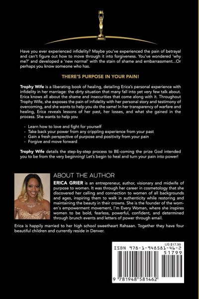 Erica Grier's debut book, Trophy Wife, is an emotional journey through tests of unwavering faith and unconditional love. To know Erica personally is to know a woman who is a vessel of intuitive wisdom. Erica's supermodel looks are no competition for her beautiful heart - a heart that desires to help every woman who experiences life's most devastating betrayal. Infidelity is a humiliating secret that many wives experience but hide in shame. Erica understands that life's most challenging moments can be the biggest opportunities for growing closer to God and your husband. In Trophy Wife, Erica courageously shares her life story with transparency and authenticity. Reading her truth on every page is like having a deep conversation with your best girlfriend. It is soul-filling, life-affirming, and wise way beyond her less-than-forty years. Supported by carefully selected verses from the Bible, Erica's counsel is a healing salve for hurting hearts and wounded marriages. She gives you hope for recovery and renewal. She reminds you why marriage is sacred and why the devil's purpose is to destroy it. After reading Trophy Wife, you'll be prepared to fight for your marriage and win. With time, prayer, and unrelenting work as a couple to repair your bond, you'll be able to trust again. You and your marriage will become whole again. Life will be beautiful again. Trophy Wife is proof. Angela G. Solomon