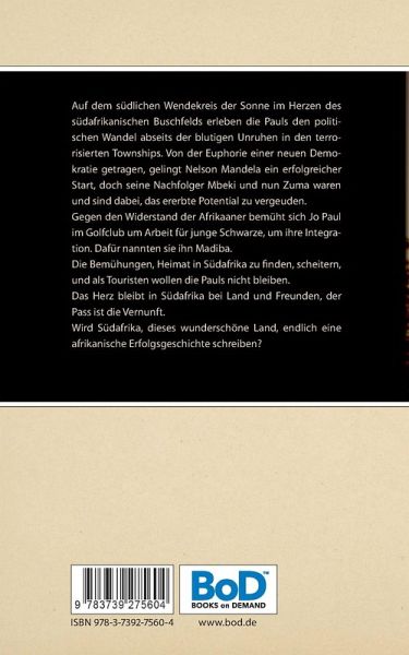Auf dem südlichen Wendekreis der Sonne im Herzen des südafrikanischen Buschfelds erleben die Pauls den politischen Wandel abseits der blutigen Unruhen in den terrorisierten Townships. Von der Euphorie einer neuen Demokratie getragen, gelingt Nelson Mandela ein erfolgreicher Start, doch seine Nachfolger Mbeki und nun Zuma waren und sind dabei, das ererbte Potential zu vergeuden.Gegen den Widerstand der Afrikaaner bemüht sich Jo Paul im Golfclub um Arbeit für junge Schwarze, um ihre Integration. Dafür nannten sie ihn Madiba.Die Bemühungen, Heimat in Südafrika zu finden, scheitern, und als Touristen wollen die Pauls nicht bleiben.Das Herz bleibt in Südafrika bei Land und Freunden, der Pass ist die Vernunft.Wird Südafrika, dieses wunderschöne Land, endlich eine afrikanische Erfolgsgeschichte schreiben?