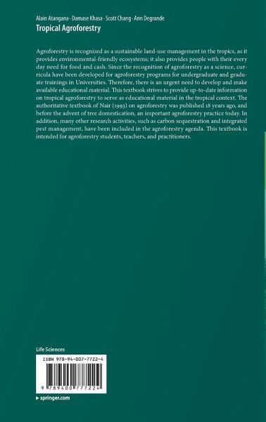 Preface.- Acknowledgements.- Table of Contents.- List of Figures.- List of Tables.- Part I: Tropical Biomes, Land Use Issues and Introduction to Agroforestry Systems.- 1. Tropical biomes: classification and description.- 2. Major Land Use Issues in the Tropics, and the History of Agroforestry.- 3. Definitions and Classification of Agroforestry Systems.- 4. Major Agroforestry Systems of the Humid Tropics.- 5. Major Agroforestry Systems of the Semiarid Tropics.- 6. Participatory Domestication of New Crops using Agroforestry Techniques.- Part II: The Benefits and Services of Agroforestry Systems.- 7. Ecological Interaction and Productivity in Agroforestry Systems.- 8. Biological Nitrogen Fixation and Mycorrhizal Associations in Agroforestry.- 9. Agroforestry for Soil Conservation.- 10. Carbon Sequestration in Agroforestry Systems.- 11. Agroforestry and Biodiversity Conservation in Tropical Landscapes.- 12. Integrated Pest Management in Tropical Agroforestry.- 13. Diagnosis and Design (D & D) Approach and Participatory Rural Appraisal (PRA).- 14. Experimental Design in Agroforestry.- 15. On-Farm Agroforestry Research.- 16. Economics in Agroforestry.- 17. Socio-Cultural Aspects of Agroforestry and Adoption.- 18. Tropical Agroforestry for Biofuels Production.- 19. Phytoremediation in Tropical Agroforestry.- 20. Agroforestry and the Carbon Market in the Tropics.- 21. Agroforestry Modeling.
