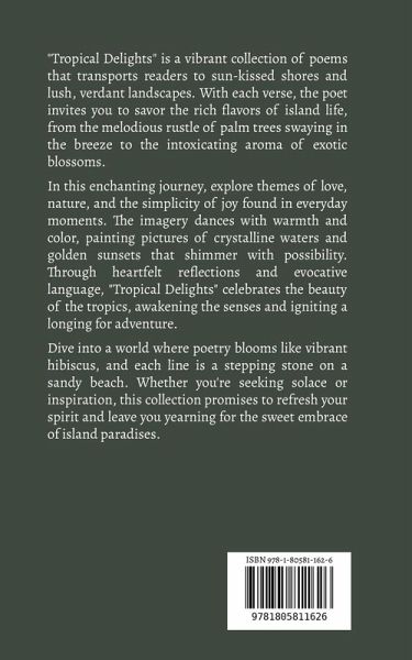 "Tropical Delights" is a vibrant collection of poems that transports readers to sun-kissed shores and lush, verdant landscapes. With each verse, the poet invites you to savor the rich flavors of island life, from the melodious rustle of palm trees swaying in the breeze to the intoxicating aroma of exotic blossoms. In this enchanting journey, explore themes of love, nature, and the simplicity of joy found in everyday moments. The imagery dances with warmth and color, painting pictures of crystalline waters and golden sunsets that shimmer with possibility. Through heartfelt reflections and evocative language, "Tropical Delights" celebrates the beauty of the tropics, awakening the senses and igniting a longing for adventure. Dive into a world where poetry blooms like vibrant hibiscus, and each line is a stepping stone on a sandy beach. Whether you're seeking solace or inspiration, this collection promises to refresh your spirit and leave you yearning for the sweet embrace of island paradises.