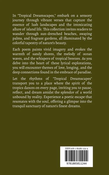 In "Tropical Dreamscapes," embark on a sensory journey through vibrant verses that capture the essence of lush landscapes and the intoxicating allure of island life. This collection invites readers to wander through sun-drenched beaches, swaying palms, and fragrant gardens, all illuminated by the colorful tapestry of nature's beauty. Each poem paints vivid imagery and evokes the warmth of sandy shores, the melody of ocean waves, and the whispers of tropical breezes. As you delve into the heart of these lyrical explorations, you will encounter themes of love, longing, and the deep connections found in the embrace of paradise. Let the rhythms of "Tropical Dreamscapes" transport you to a place where the spirit of the tropics dances on every page, inviting you to pause, reflect, and dream amidst the splendor of a world unbound by reality. Experience a poetic escape that resonates with the soul, offering a glimpse into the tranquil sanctuary of nature's finest dreams.