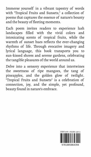 Immerse yourself in a vibrant tapestry of words with "Tropical Fruits and Sunsets," a collection of poems that captures the essence of nature's bounty and the beauty of fleeting moments. Each poem invites readers to experience lush landscapes filled with the vivid colors and intoxicating scents of tropical fruits, while the warmth of sunset hues reflects the ever-changing rhythms of life. Through evocative imagery and lyrical language, this book transports you to sun-kissed shores and serene gardens, celebrating the tangible pleasures of the world around us. Delve into a sensory experience that intertwines the sweetness of ripe mangoes, the tang of pineapples, and the golden glow of twilight. "Tropical Fruits and Sunsets" is a celebration of connection, joy, and the simple, yet profound, beauty found in nature's embrace.