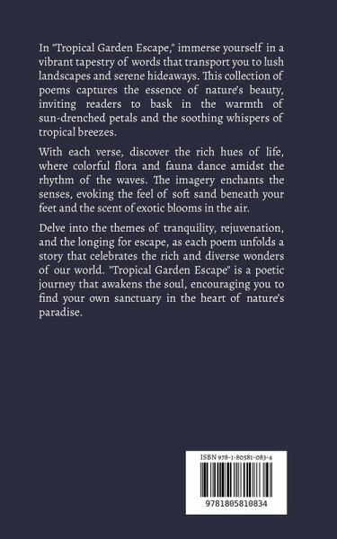In "Tropical Garden Escape," immerse yourself in a vibrant tapestry of words that transport you to lush landscapes and serene hideaways. This collection of poems captures the essence of nature's beauty, inviting readers to bask in the warmth of sun-drenched petals and the soothing whispers of tropical breezes. With each verse, discover the rich hues of life, where colorful flora and fauna dance amidst the rhythm of the waves. The imagery enchants the senses, evoking the feel of soft sand beneath your feet and the scent of exotic blooms in the air. Delve into the themes of tranquility, rejuvenation, and the longing for escape, as each poem unfolds a story that celebrates the rich and diverse wonders of our world. "Tropical Garden Escape" is a poetic journey that awakens the soul, encouraging you to find your own sanctuary in the heart of nature's paradise.