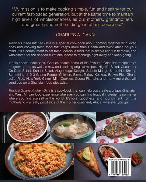 Tropical Ghana Kitchen Date is a special cookbook about coming together with loved ones and cooking fresh food that keeps more than Ghana and West Africa on your mind. It's a commitment to eat fresh, delicious food that is simple and fun to make, and wholesome for the needed nutritional boost to recharge right away and keep going. In this special cookbook, Charles shares some of his favourite Ghanaian recipes that he grew up on, as well as new and exciting original recipes: Highlife Salad, Cucumber On Date Salad, Sunset Salad, Aluguntugui Delight, Sobolo Mango Smoothie, Shrimp Something, 1-2-3 Ghana Pepper Chicken, Blema Turkey Kpakpa, Brown Rice Ghana Jollof Rice, New York Ginger Mint Cookies, Cocoa Plantain, and many more that will send you on a Ghanaian food plot twist. Tropical Ghana Kitchen Date is a cookbook that can help you create a unique Ghanaian and West African food experience wherever you can find tropical ingredients no matter where you find yourself in the world. It's love, goodness, and nourishment from the motherland - a really good slice of the mother continent, Africa, wherever you go.