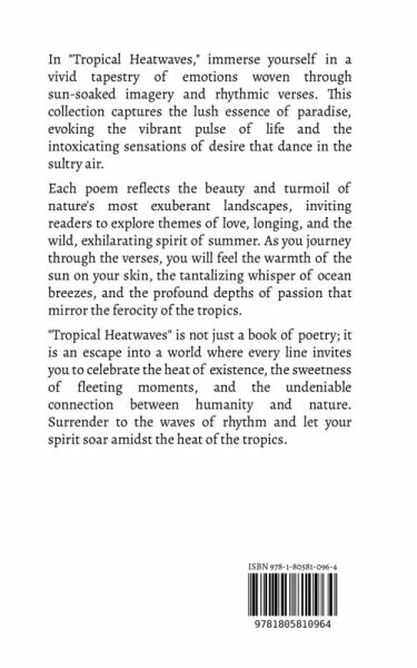 In "Tropical Heatwaves," immerse yourself in a vivid tapestry of emotions woven through sun-soaked imagery and rhythmic verses. This collection captures the lush essence of paradise, evoking the vibrant pulse of life and the intoxicating sensations of desire that dance in the sultry air. Each poem reflects the beauty and turmoil of nature's most exuberant landscapes, inviting readers to explore themes of love, longing, and the wild, exhilarating spirit of summer. As you journey through the verses, you will feel the warmth of the sun on your skin, the tantalizing whisper of ocean breezes, and the profound depths of passion that mirror the ferocity of the tropics. "Tropical Heatwaves" is not just a book of poetry; it is an escape into a world where every line invites you to celebrate the heat of existence, the sweetness of fleeting moments, and the undeniable connection between humanity and nature. Surrender to the waves of rhythm and let your spirit soar amidst the heat of the tropics.