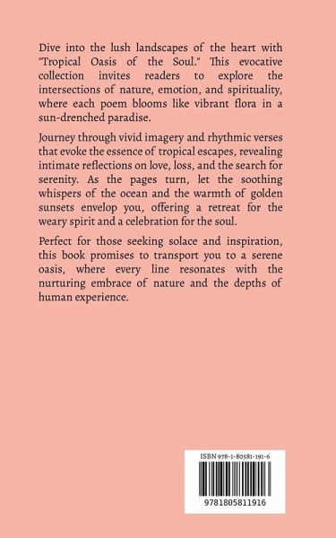 Dive into the lush landscapes of the heart with "Tropical Oasis of the Soul." This evocative collection invites readers to explore the intersections of nature, emotion, and spirituality, where each poem blooms like vibrant flora in a sun-drenched paradise. Journey through vivid imagery and rhythmic verses that evoke the essence of tropical escapes, revealing intimate reflections on love, loss, and the search for serenity. As the pages turn, let the soothing whispers of the ocean and the warmth of golden sunsets envelop you, offering a retreat for the weary spirit and a celebration for the soul. Perfect for those seeking solace and inspiration, this book promises to transport you to a serene oasis, where every line resonates with the nurturing embrace of nature and the depths of human experience.