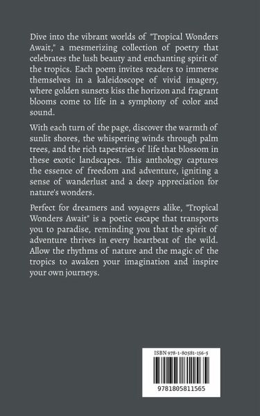 Dive into the vibrant worlds of "Tropical Wonders Await," a mesmerizing collection of poetry that celebrates the lush beauty and enchanting spirit of the tropics. Each poem invites readers to immerse themselves in a kaleidoscope of vivid imagery, where golden sunsets kiss the horizon and fragrant blooms come to life in a symphony of color and sound. With each turn of the page, discover the warmth of sunlit shores, the whispering winds through palm trees, and the rich tapestries of life that blossom in these exotic landscapes. This anthology captures the essence of freedom and adventure, igniting a sense of wanderlust and a deep appreciation for nature's wonders. Perfect for dreamers and voyagers alike, "Tropical Wonders Await" is a poetic escape that transports you to paradise, reminding you that the spirit of adventure thrives in every heartbeat of the wild. Allow the rhythms of nature and the magic of the tropics to awaken your imagination and inspire your own journeys.