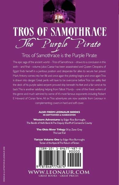 Tros of Samothrace is the Purple Pirate The epic saga of the ancient world-Tros of Samothrace-draws to a conclusion in this sixth-and final-volume. Julius Caesar has been assassinated and Queen Cleopatra of Egypt finds herself in a perilous position and desperate for allies to secure her power. Mark Antony comes into her life and once again the plotting begins and once again Tros is drawn into danger. Great perils will have to be overcome before Tros can safely feel the deck of his purple sailed, serpent prowed ship beneath his feet and a fair wind at his back. This is another satisfying helping from Talbot Mundy-one of the finest writers of this genre and much admired by some of it's most famous exponents including Robert E Howard of Conan fame. All six Tros adventures are now available from Leonaur in complementing covers in hard and soft cover.