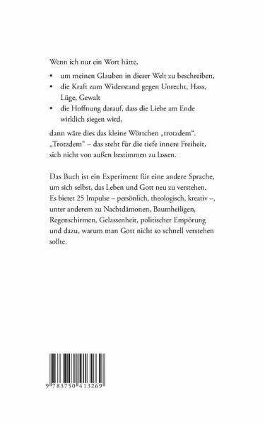 Wenn ich nur ein Wort hätte, um meinen Glauben in dieser Welt zu beschreiben, die Kraft zum Widerstand gegen Unrecht, Hass, Lüge, Gewalt, die Hoffnung darauf, dass die Liebe am Ende wirklich siegen wird, dann wäre dies das kleine Wörtchen "trotzdem". "Trotzdem" - das steht für die tiefe innere Freiheit, sich nicht von außen bestimmen zu lassen. Das Buch ist ein Experiment für eine andere Sprache, um sich selbst, das Leben und Gott neu zu verstehen. Es bietet 25 Impulse - persönlich, theologisch, kreativ -, u.a. zu Nachtdämonen, Baumheiligen, Regenschirmen, Gelassenheit, politischer Empörung und dazu, warum man Gott nicht so schnell verstehen sollte.
