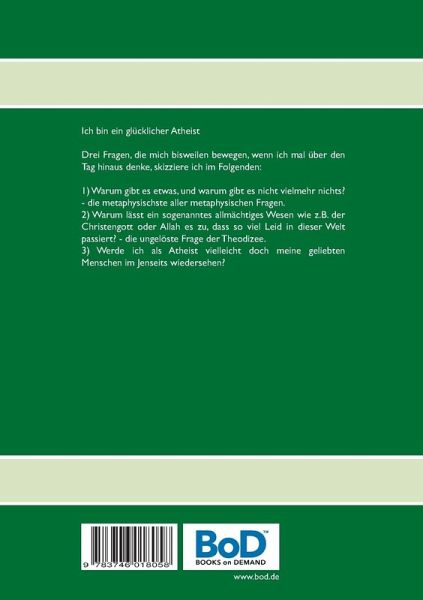 Ich bin ein glücklicher AtheistDrei Fragen, die mich bisweilen bewegen, wenn ich mal über den Tag hinaus denke, skizziere ich im Folgenden:1) Warum gibt es etwas, und warum gibt es nicht vielmehr nichts? - die metaphysischste aller metaphysischen Fragen.2) Warum lässt ein sogenanntes allmächtiges Wesen, wie z.B. der Christengott oder Allah, es zu, dass so viel Leid in dieser Welt passiert? - die ungelöste Frage der Theodizee.3) Werde ich als Atheist vielleicht doch meine geliebten Menschen im Jenseits wiedersehen?