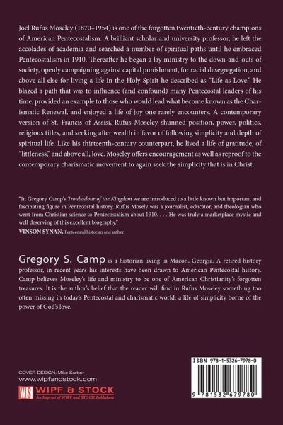 Joel Rufus Moseley (1870-1954) is one of the forgotten twentieth-century champions of American Pentecostalism. A brilliant scholar and university professor, he left the accolades of academia and searched a number of spiritual paths until he embraced Pentecostalism in 1910. Thereafter he began a lay ministry to the down-and-outs of society, openly campaigning against capital punishment, for racial desegregation, and above all else for living a life in the Holy Spirit he described as ""Life as Love."" He blazed a path that was to influence (and confound) many Pentecostal leaders of his time, provided an example to those who would lead what become known as the Charismatic Renewal, and enjoyed a life of joy one rarely encounters. A contemporary version of St. Francis of Assisi, Rufus Moseley shunned position, power, politics, religious titles, and seeking after wealth in favor of following simplicity and depth of spiritual life. Like his thirteenth-century counterpart, he lived a life of gratitude, of ""littleness,"" and above all, love. Moseley offers encouragement as well as reproof to the contemporary charismatic movement to again seek the simplicity that is in Christ.