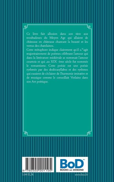 Ce livre fait allusion dans son titre aux troubadour du Moyen Age qui allaient de châteaux en châteaux chantant la beauté et les vertus des chatelaines.Cette métaphore indique clairement qu'il s,*'agit majoritairement de poèmes célébrant l'amour qui dans la littérature médiévale se nommait l'amour courtois et qui prit au XIX -ème siècle fut nommée le romantisme. Cette poésie est une poésie rythmée par des dodécasyllabes et des rythmes qui essaient de s'éclairer de l'harmonie imitative et de musique comme le conseillait Verlaine dans son Art poétique.