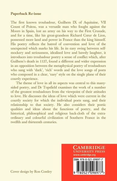 The first known troubadour, Guilhem IX of Aquitaine, VII Count of Poitou, was a versatile man who fought against the Moors in Spain, lost an army on his way to the First Crusade, and for a time, like his great-grandson Richard Cur de Lion, possessed more land and power in France than the king himself. His poetry reflects the hatred of convention and love of the unexpected that marks his life. In its easy swing between self-mockery and seriousness, idealised love and bawdy laughter, it introduces into troubadour poetry a sense of conflict which, after Guilhem's death in 1127, found a different and wider expression in an opposition between the metaphysical poetry of troubadours who sang with 'dark', 'rich' words and the love songs of poets who composed in a clear, 'easy' style on the single plane of their courtly experience. Dr Topsfield examines the work of a number of the greatest troubadours from the viewpoint of their attitudes to love.