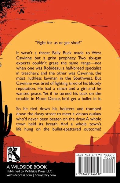 "Fight for us or get shot!" It wasn’t a threat Bally Buck made to West Cawinne but a grim prophecy. Two six-gun experts couldn’t graze the same range—not when one was Robideau, a half-breed specialist in treachery, and the other was Cawinne, the most ruthless lawman in the Southwest. But Cawinne was tired of fighting, tired of his bloody reputation. He had a ranch and a girl and he wanted peace. Yet if he turned his back on the trouble in Moon Dance, he’d get a bullet in it. So he tied down his holsters and tramped down the dusty street to meet a vicious outlaw who’d never been beaten on the draw. A whole town held its breath. And a whole town’s life hung on the bullet-spattered outcome!
