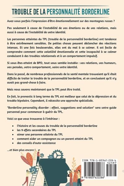 Avez-vous parfois l'impression d'être émotionnellement sur des montagnes russes ? Pas seulement à cause de l'instabilité de vos émotions ou de vos relations, mais aussi à cause de l'instabilité de votre identité. Les personnes atteintes du TPL (trouble de la personnalité borderline) ont tendance à être extrêmement sensibles. De petites choses peuvent déclencher des réactions intenses. Et une fois bouleversées, elles ont du mal à se calmer. Il est facile de comprendre comment cette volatilité émotionnelle et cette incapacité à se calmer conduisent à des troubles relationnels et à un comportement impulsif. Si vous êtes atteint de BPD, tout vous semble instable : vos relations, vos humeurs, vos pensées, votre comportement, voire votre identité. Dans le passé, de nombreux professionnels de la santé mentale trouvaient qu'il était difficile de traiter le trouble de la personnalité borderline, et en concluaient qu'il n'y avait pas grand-chose à faire. Mais nous savons maintenant que le TPL peut être traité. En fait, le pronostic à long terme du TPL est meilleur que celui de la dépression et du trouble bipolaire. Cependant, il nécessite une approche spécialisée. "Borderline personality disorder : effect, suggestions and solution" sera votre guide personnel pour commencer à guérir du TPL. Voici ce que vous trouverez à l'intérieur : l'histoire et les causes du trouble de la personnalité borderline les 9 effets secondaires du TPL aimer une personne atteinte du TPL comment aider un compagnon ou un parent atteint du TPL des conseils d'auto-assistance ...et bien plus encore !