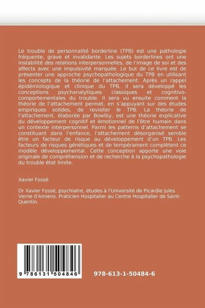 Le trouble de personnalité borderline (TPB) est une pathologie fréquente, grave et invalidante. Les sujets borderlines ont une instabilité des relations interpersonnelles, de l image de soi et des affects avec une impulsivité marquée. Le but de ce livre est de présenter une approche psychopathologique du TPB en utilisant les concepts de la théorie de l attachement. Après un rappel épidémiologique et clinique du TPB, il sera développé les conceptions psychanalytiques classiques et cognitivo-comportementales du trouble. Il sera vu ensuite comment la théorie de l attachement permet, en s appuyant sur des études empiriques solides, de revisiter le TPB. La théorie de l attachement, élaborée par Bowlby, est une théorie explicative du développement cognitif et émotionnel de l être humain dans un contexte interpersonnel. Parmi les patterns d attachement se constituant dans l enfance, l attachement désorganisé semble être un facteur de risque au développement d un TPB. Les facteurs de risques génétiques et de tempérament complètent ce modèle développemental. Cette conception apporte une voie originale de compréhension et de recherche à la psychopathologie du trouble état limite.